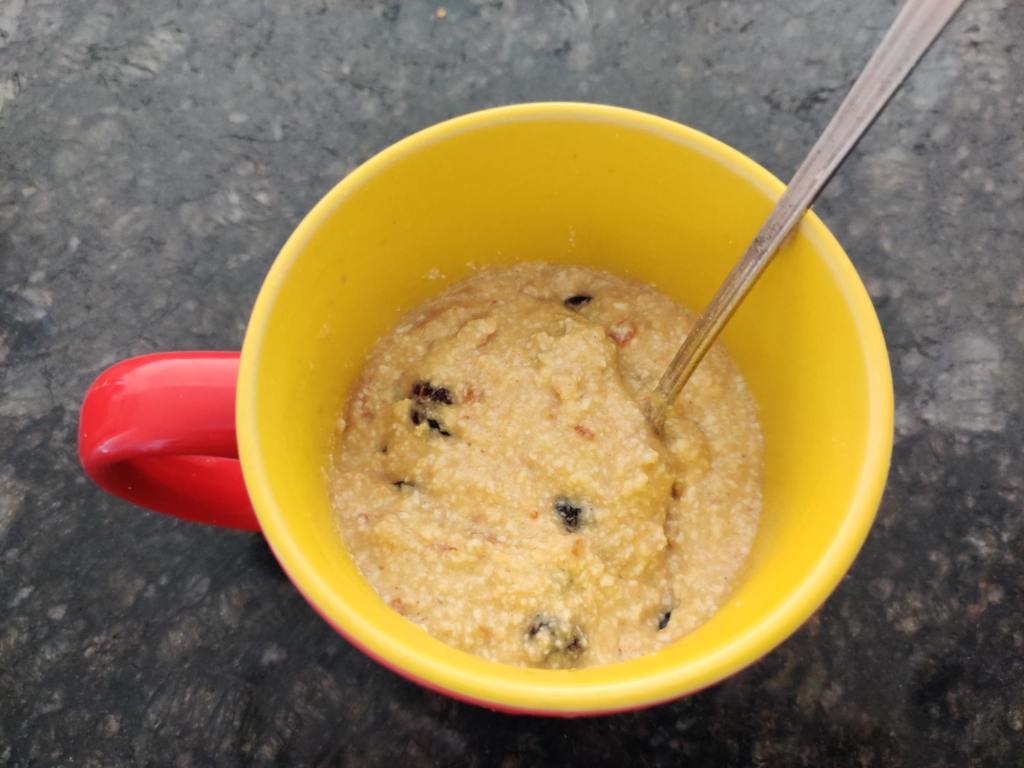 Using a mug, beat together the tahini, cottage cheese, egg, and xylitol. You can use a fork to make it mostly smooth, though it will be hard to tell wth the cottage cheese curds. (you can also blend separately and pour the mixture into the mug).